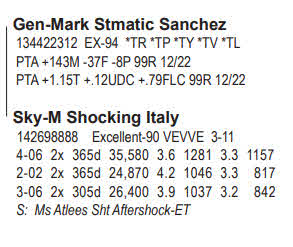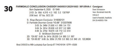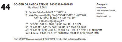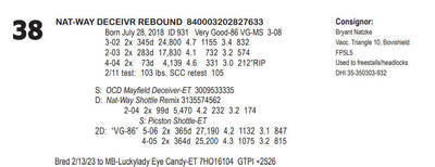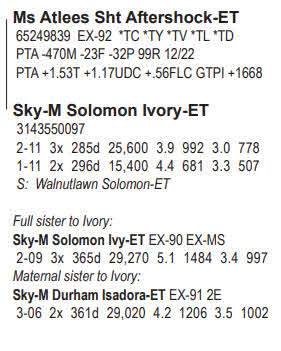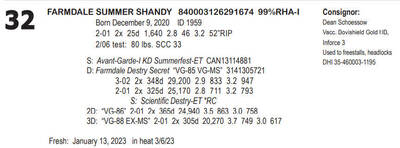 March Dairy Production Sale W4226 Hwy 23, Fond du Lac WI, 54937 Great offering of genetics... Contact Agent: Cady McGehee 863-697-0955 Catalog | Terms of Auction Download CATALOG Download SALE ORDER Catalog | Terms Download CATALOG Download SALE ORDER All Items (58) Cattle (58) Categories All Items (58) Cattle (58) Search Item #: Keyword: Search Catalog Item #: Keyword: 20 items per page 50 items per page 100 items per page Go to page #: 1 , 2 , 3 #21 – BRICCOWS AFTRSHOCK DUCE 840003200653757 Born July 1, 2019 Index No. 576 Very Good-85 2-05 2-00 2x 249d 19,760 3.5 689 2.9 564 2-10 2x 293d 21,243 3.2 670 3.0 633 RIP 2/24 test: 64.9 lbs. SCC 13 Bred 8/05/22 to Angus Location: W4226 Hwy 23, Fond du Lac WI, 54937 Contact Agent: Cady McGehee 863-697-0955 More Info / Bid Now Track this Item Sold High Bid: $1,850.00 – #500 #21 – BRICCOWS AFTRSHOCK DUCE Sold High Bid: $1,850 More Details More Info / Bid Track Item 840003200653757 Born July 1, 2019 Index No. 576 Very Good-85 2-05 2-00 2x 249d 19,760 3.5 689 2.9 564 2-10 2x 293d 21,243 3.2 670 3.0 633 RIP 2/24 test: 64.9 lbs. SCC 13 Bred 8/05/22 to Angus Location: W4226 Hwy 23, Fond du Lac WI, 54937 Contact Agent: Cady McGehee 863-697-0955 #22 – BRICCOWS DIESEL FRIUT SNACK 840003200653763 Born November 2, 2019 Index No. 582 Very Good-85 VG-MS 2-08 2-01 2x 311d 18,200 3.2 590 3.1 568 3-02 2x 44d 4,271 3.7 159 2.8 119 RIP 2/24 test: 105.1 lbs. SCC 29 Fresh: January 12, 2023 Location: W4226 Hwy 23, Fond du Lac WI, 54937 Contact Agent: Cady McGehee 863-697-0955 More Info / Bid Now Track this Item Sold High Bid: $2,250.00 – #1018 #22 – BRICCOWS DIESEL FRIUT SNACK Sold High Bid: $2,250 More Details More Info / Bid Track Item 840003200653763 Born November 2, 2019 Index No. 582 Very Good-85 VG-MS 2-08 2-01 2x 311d 18,200 3.2 590 3.1 568 3-02 2x 44d 4,271 3.7 159 2.8 119 RIP 2/24 test: 105.1 lbs. SCC 29 Fresh: January 12, 2023 Location: W4226 Hwy 23, Fond du Lac WI, 54937 Contact Agent: Cady McGehee 863-697-0955 #23 – SKY-M AFTERSHOCK IVONNE 840003220290790 Born February 11, 2021 Index No. 613 Entered in 2024 Shawano Co. Futurity Bred 8/10/22 to Sonnek GC Corvette-ET 7HO12042 Location: W4226 Hwy 23, Fond du Lac WI, 54937 Contact Agent: Cady McGehee 863-697-0955 More Info / Bid Now Track this Item Sold High Bid: $2,300.00 – #500 #23 – SKY-M AFTERSHOCK IVONNE Sold High Bid: $2,300 More Details More Info / Bid Track Item 840003220290790 Born February 11, 2021 Index No. 613 Entered in 2024 Shawano Co. Futurity Bred 8/10/22 to Sonnek GC Corvette-ET 7HO12042 Location: W4226 Hwy 23, Fond du Lac WI, 54937 Contact Agent: Cady McGehee 863-697-0955 #24 – SKY-M DEFIANT IDEE 840003200653746 Born February 19, 2019 Index No. 565 Very Good-86 VG-MS 2-10 2-04 2x 316d 22,890 4.1 941 3.3 757 3-04 2x 225d 17,604 4.3 763 3.3 581 RIP 2/24 test: 51.6 lbs. SCC 100 Bred 12/05/22 to Angus Location: W4226 Hwy 23, Fond du Lac WI, 54937 Contact Agent: Cady McGehee 863-697-0955 More Info / Bid Now Track this Item Sold High Bid: $2,250.00 – #500 #24 – SKY-M DEFIANT IDEE Sold High Bid: $2,250 More Details More Info / Bid Track Item 840003200653746 Born February 19, 2019 Index No. 565 Very Good-86 VG-MS 2-10 2-04 2x 316d 22,890 4.1 941 3.3 757 3-04 2x 225d 17,604 4.3 763 3.3 581 RIP 2/24 test: 51.6 lbs. SCC 100 Bred 12/05/22 to Angus Location: W4226 Hwy 23, Fond du Lac WI, 54937 Contact Agent: Cady McGehee 863-697-0955 #25 – SKY-M SANCHEZ ISRAEL 143562250 Born July 21, 2015 Index No. 475 35SVR1396 Excellent-93 EEEEE 2E 7-00 4-08 2x 365d 35,180 3.9 1387 3.0 1046 6-03 2x 345d 35,560 3.7 1308 2.9 1039 3-05 2x 365d 31,770 4.1 1305 3.3 1035 2-04 2x 349d 27,907 4.1 1158 3.1 876 7-03 2x 118d 12,583 4.2 534 3.1 390 RIP 2/24 test: 110.8 lbs. SCC 141 Bred 2/25/23 Location: W4226 Hwy 23, Fond du Lac WI, 54937 Contact Agent: Cady McGehee 863-697-0955 More Info / Bid Now Track this Item Sold High Bid: $2,000.00 – #1016 #25 – SKY-M SANCHEZ ISRAEL Sold High Bid: $2,000 More Details More Info / Bid Track Item 143562250 Born July 21, 2015 Index No. 475 35SVR1396 Excellent-93 EEEEE 2E 7-00 4-08 2x 365d 35,180 3.9 1387 3.0 1046 6-03 2x 345d 35,560 3.7 1308 2.9 1039 3-05 2x 365d 31,770 4.1 1305 3.3 1035 2-04 2x 349d 27,907 4.1 1158 3.1 876 7-03 2x 118d 12,583 4.2 534 3.1 390 RIP 2/24 test: 110.8 lbs. SCC 141 Bred 2/25/23 Location: W4226 Hwy 23, Fond du Lac WI, 54937 Contact Agent: Cady McGehee 863-697-0955 #26 – SKY-M DIESEL INPUT 840003200653759 Born September 1, 2019 Index No. 578 Good Plus-82 2-03 2-00 2x 365d 23,270 4.0 939 3.3 762 SCC: 117 Fresh: February 27, 2023 Location: W4226 Hwy 23, Fond du Lac WI, 54937 Contact Agent: Cady McGehee 863-697-0955 More Info / Bid Now Track this Item Sold High Bid: $1,750.00 – #500 #26 – SKY-M DIESEL INPUT Sold High Bid: $1,750 More Details More Info / Bid Track Item 840003200653759 Born September 1, 2019 Index No. 578 Good Plus-82 2-03 2-00 2x 365d 23,270 4.0 939 3.3 762 SCC: 117 Fresh: February 27, 2023 Location: W4226 Hwy 23, Fond du Lac WI, 54937 Contact Agent: Cady McGehee 863-697-0955 #27 – SKY-M AWESOME ID *RC 840003200653779 Born August 5, 2020 Index No. 598 2-00 2x 177d 11,827 4.1 480 2.9 344 RIP 2/24 test: 66.9 lbs. SCC 54 Bred 11/20/22 to Mr Blondin Warrior-Red-ET 7HO14477 Location: W4226 Hwy 23, Fond du Lac WI, 54937 Contact Agent: Cady McGehee 863-697-0955 More Info / Bid Now Track this Item Sold High Bid: $2,400.00 – #500 #27 – SKY-M AWESOME ID *RC Sold High Bid: $2,400 More Details More Info / Bid Track Item 840003200653779 Born August 5, 2020 Index No. 598 2-00 2x 177d 11,827 4.1 480 2.9 344 RIP 2/24 test: 66.9 lbs. SCC 54 Bred 11/20/22 to Mr Blondin Warrior-Red-ET 7HO14477 Location: W4226 Hwy 23, Fond du Lac WI, 54937 Contact Agent: Cady McGehee 863-697-0955 #28 – MILKSOURCE CHROME ANNANICOLE 840003205612568 Born June 29, 2020 Index No. 8048 Very Good-84% 2-01 1-11 2x 269d 14,598 4.8 702 3.2 473 RIP 2/24 test: 47.8 lbs. SCC 29 Bred 8/16/22 to Ratliff Money 117800702 Location: W4226 Hwy 23, Fond du Lac WI, 54