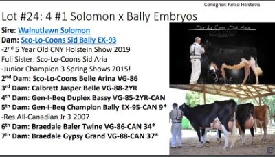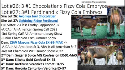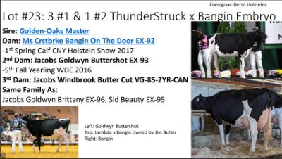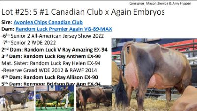 -Selling price is per Embryo -Buyer is responsible for all costs of shipping expenses. This auction will utilize an auto-extend, soft closing. With this feature, the bidding will close on 2 lots at the same time. Bidding will start to close from 7 pm to 7:02 if any lots receive a bid in the last minute of bidding they will extend bidding on that specific lot for an additional 2 minutes. Once 2 minutes have lapsed without any bidding activity, then that lot will close;