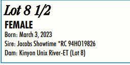 This auction will utilize an auto-extend, soft closing. With this feature, the bidding will close on 2 lots at the same time. Bidding will start to close at 3:00 pm CST if a lot receive a bid in the last minute of bidding, they will extend bidding on that specific lot for an additional 1 minute. Once 1 minute has lapsed without any bidding activity, then the lot will close. All animals will need to be moved within 10 days. After 10 days, there will be a charge of $10 per day boarding fee