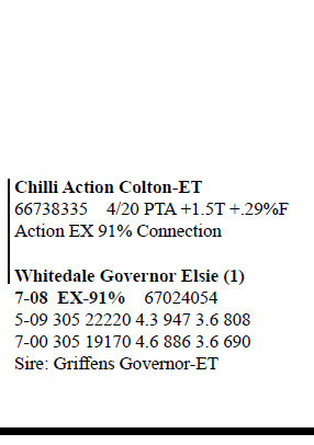 3-00 EX-90% 67024055 ID Eartag 5 Born 12/1/16 1-09 227 9406 5.0 469 3.8 359 2-10 208 10396 5.1 533 3.7 380 RIP Last test- 40 lbs 4.1%F 4.2%P SCC 100,000 Fresh 10/22/19 Bred 12/6/19, Due 9/10/20 to 91JE5757 Black Apple